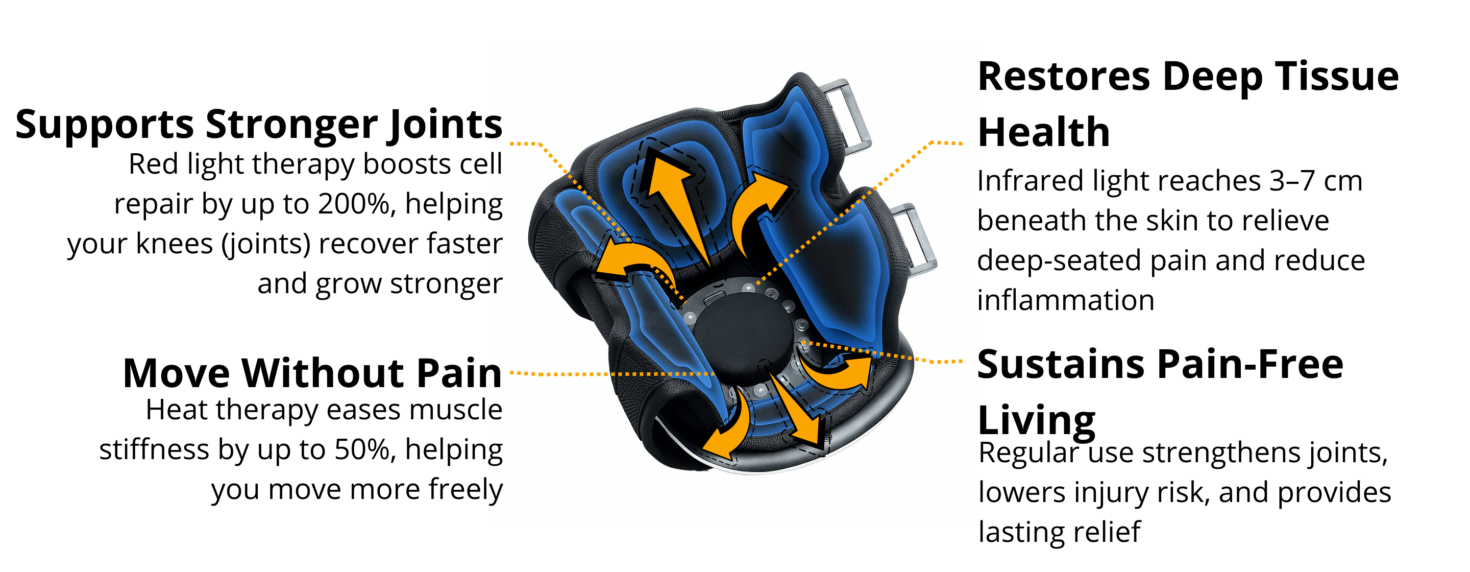 Designed for knees, shoulders, and elbows, our 3-in-1 device combines three therapies to ease osteoarthritis, reduce swelling, relieve joint pain, and support recovery after exercise